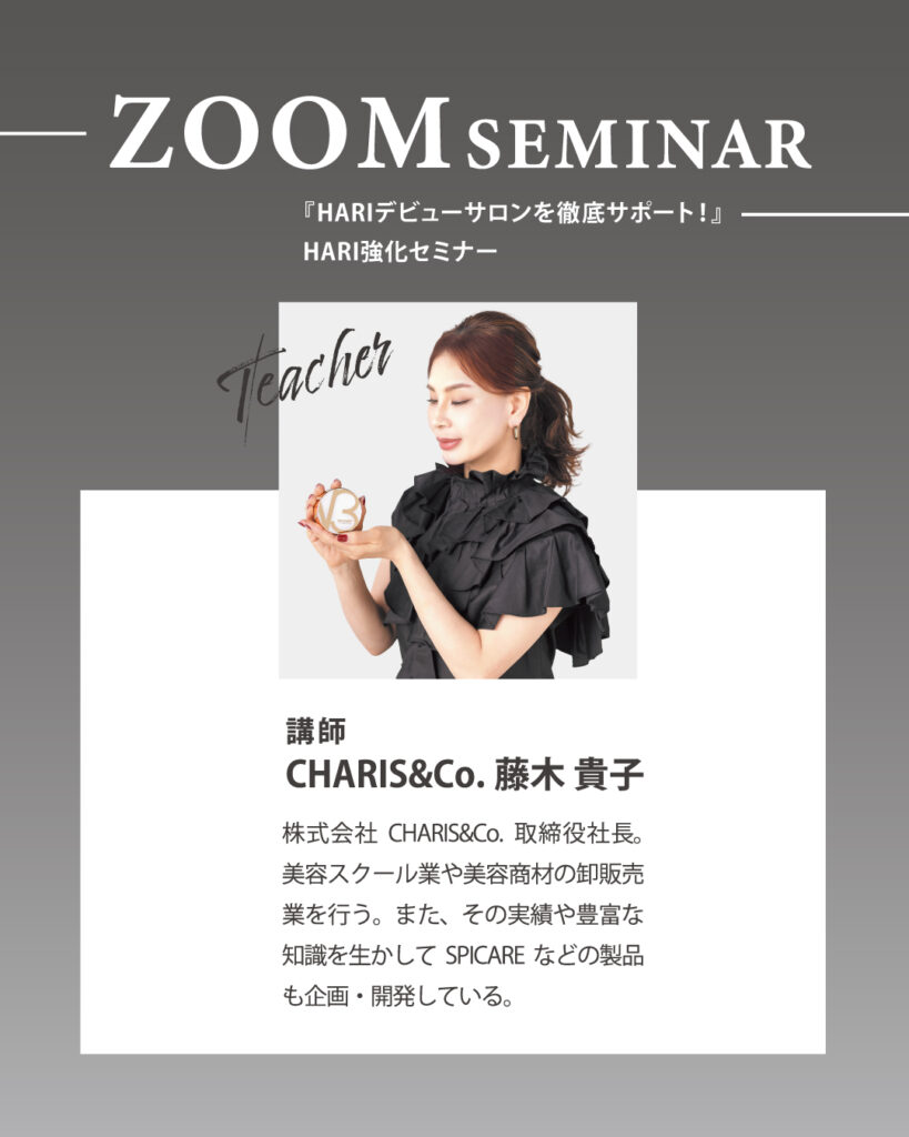 | 詳細 | 内容:HARIデビューサロンを徹底サポート! HARI強化セミナー 講師:CHARIS&Co 広報スタッフ 定員:3,000名 |